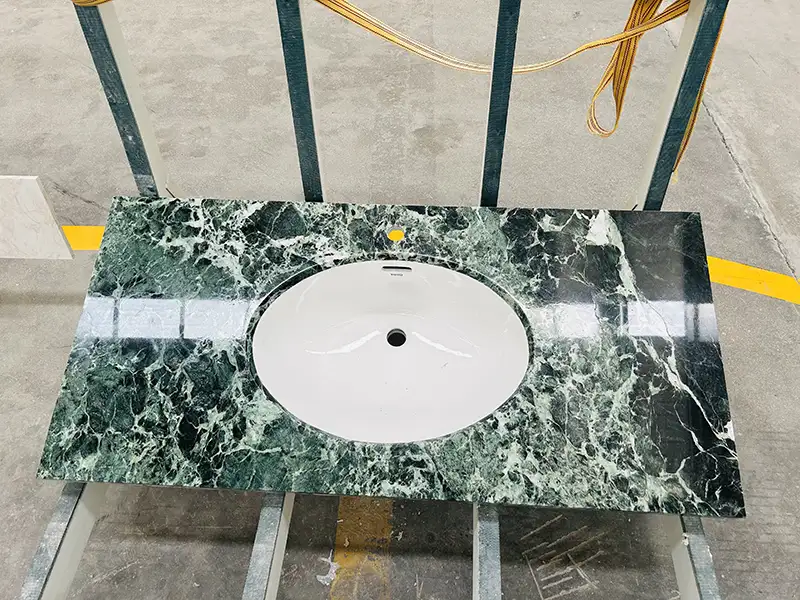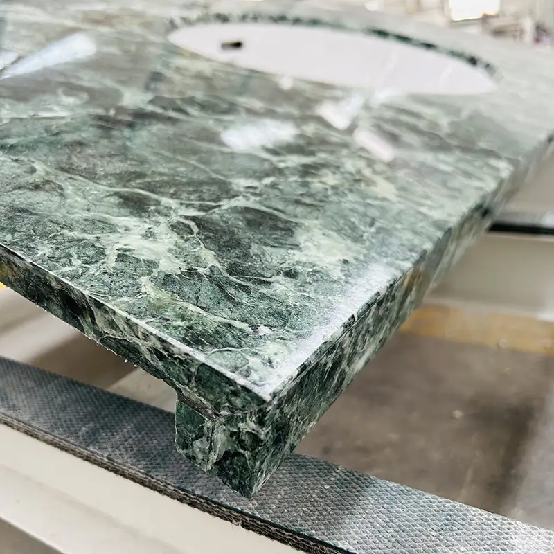 Zwracamy szczególną uwagę na każdy niestandardowy marmurowy top próżności, który tworzymy, bez względu na kształt lub rozmiar. Obejmuje to wybór odpowiedniej marmurowej płytki lub płyty Verde, polerowanie jej, pakowanie i wysyłanie.